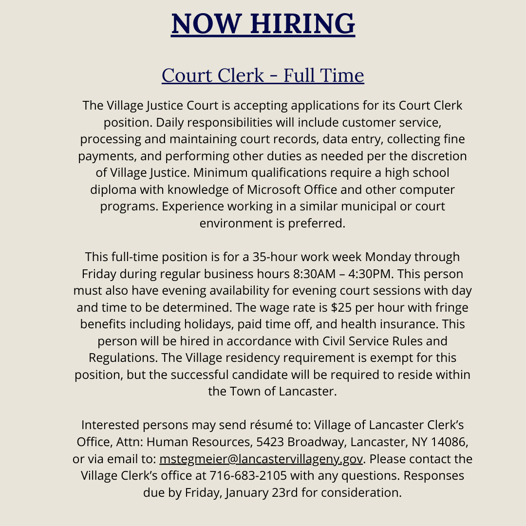 The Village of Lancaster is now accepting applications for the position of Full Time Court Clerk. To view the posting, please click here.